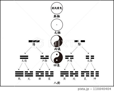 無極から八卦形成までを図示 無極、両儀、太極、四象、八卦という易の基本シンボルがまとめられています。