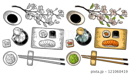Set Sushi. Vintage color vector engraving. Isolated on white background.