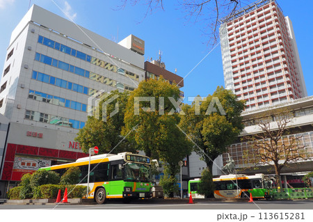 日本の東京都市景観 日暮里駅前の銅像や街並みなどを望む