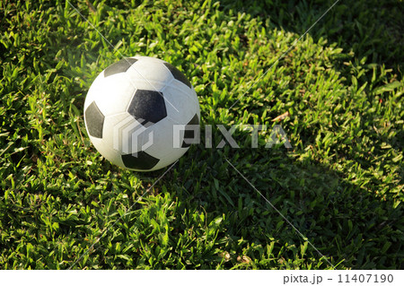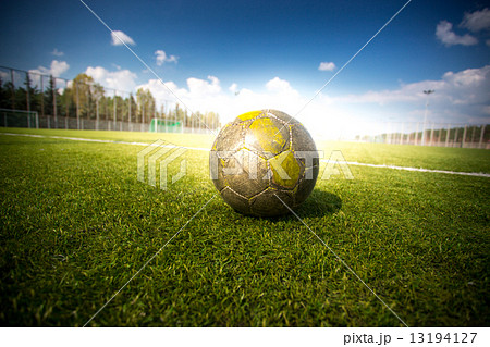 soccer football on grass field at sun beams