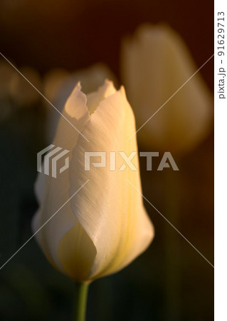 Closeup of white Tulips against a soft sunset light on a summers day with copyspace. Zoom in on seasonal flowers growing in a field or garden. Details, texture and natures pattern of a flowerhead