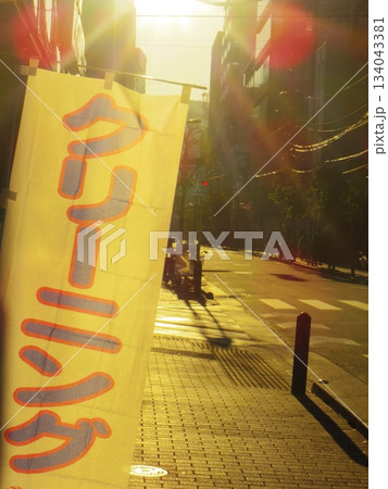 夕日に照らされるのぼり旗