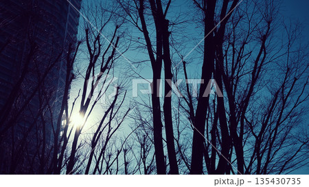 逆光の冬のプラタナスの樹形 縦位置