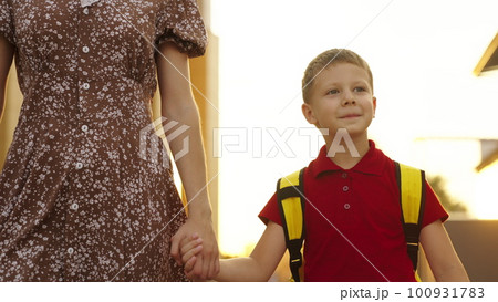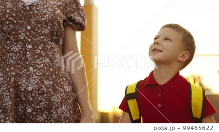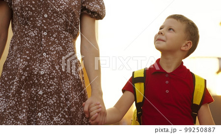 mother holds hand child school backpack glare sunlight. happy family concept. mother child go lesson school class. child boy go school early morning. sunlight. parent child first school bag lesson
