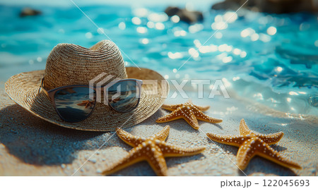 エキゾチックな夏の雰囲気、熱帯の景色を映し出す麦わら帽子とサングラス