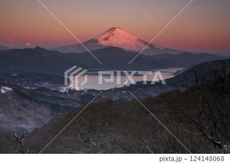 箱根大観山眺めた朝焼けの富士、芦ノ湖、沈む満月