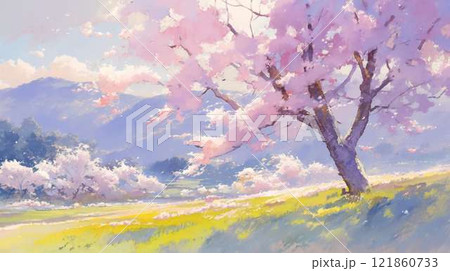 春の丘と満開の桜、穏やかな山並みと暖かな陽射しの風景