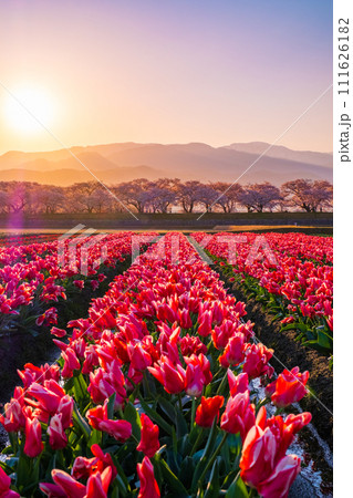 三重県桑名市長島町 長良川水辺のなばなの里 夕暮れのチューリップ畑