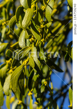 Viscum album mistletoe growing on deciduous tree branches in bright daylight during early winter season