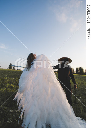 A samurai kills an angel with a katana in a vast grassy field under a clear blue sky, creating a dramatic contrast between light and dark. A samurai warrior with a katana stabs a snow-white angel.