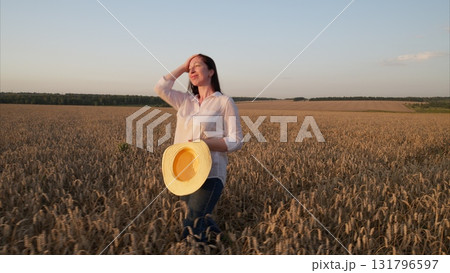 A woman in a wheat field at sunset is fully embracing the beauty of nature around her