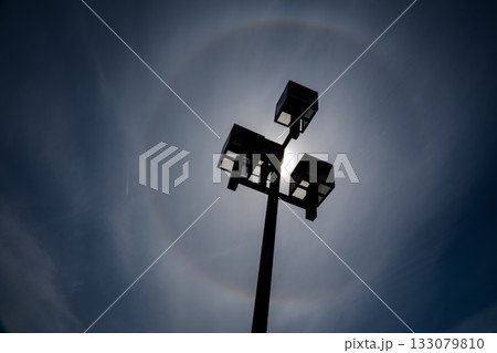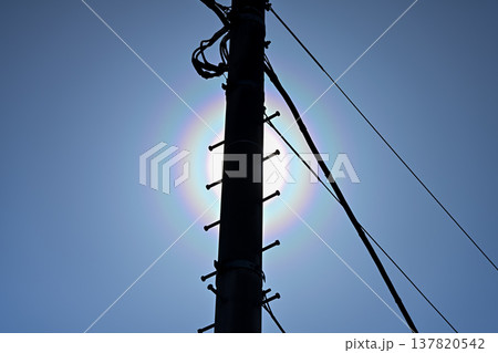 冬の空に浮かぶ飛行機雲 光の同折による太陽の周りに同心円状にできた七色のパステルカラーの