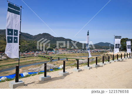 〈島根県〉月山富田城 太鼓壇公園 満開の桜と旗印 4月