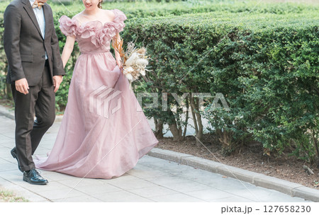 洋館の庭をピンクのドレスで歩きウェディングフォトを撮るカップル