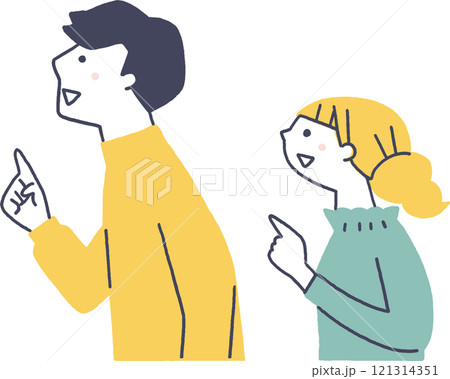 横向きに指差す若い男女