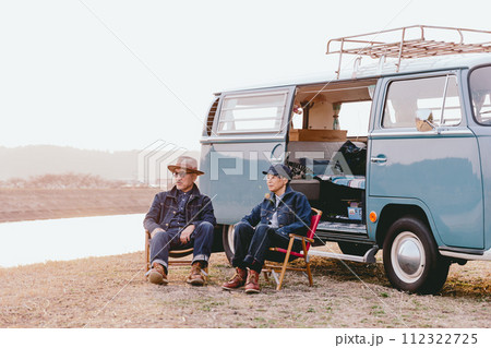 夕暮れの中にアウトドアの椅子に座って佇むシニア夫婦