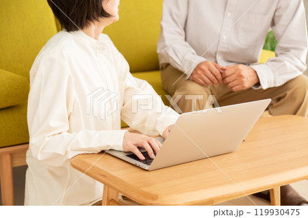 リビングでパソコンを見ながら話し合いをするミドル〜シニア夫婦