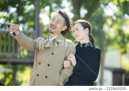 新緑を楽しむシニア夫婦、アベック、中高年、デイト、散歩