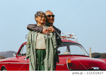 愛車バックに寄り添うシニア夫婦の写真