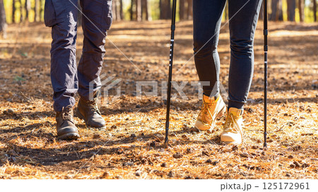 Front view. Lovely couple are on the walk in autumn park with two dogs
