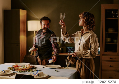 Medium close up of beloved wife and husband exchanging gifts while celebrating X-mas at festive table with huge number of traditional dishes and champagne