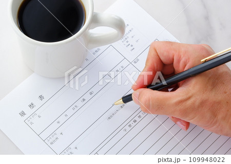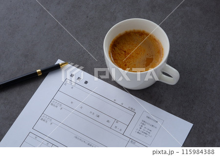 就職活動(就活)のために、コーヒーを飲みながら、履歴書を作成する