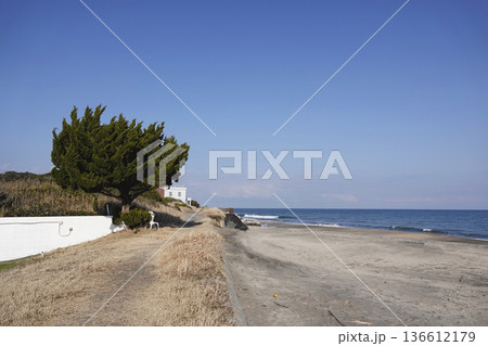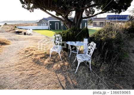 冬のビーチ沿い 大きな常緑樹の下に設置された白い椅子とテーブル