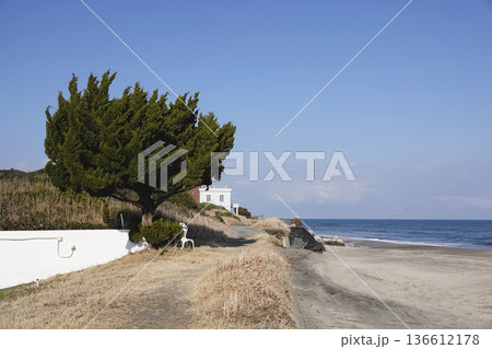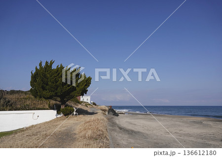 海岸沿いの白い建物と大きな常緑樹