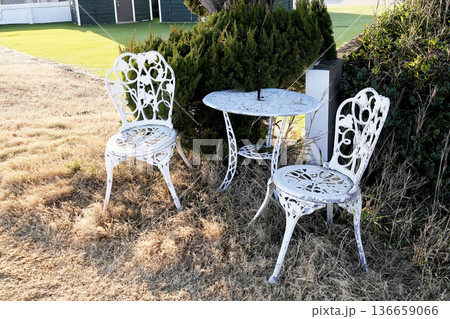 冬のビーチ沿い 大きな常緑樹の下に設置された白い椅子とテーブル