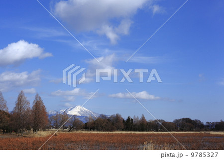 滋賀県長浜市の奥びわスポーツの森に隣接する内湖と雪化粧の伊吹山と秋景色