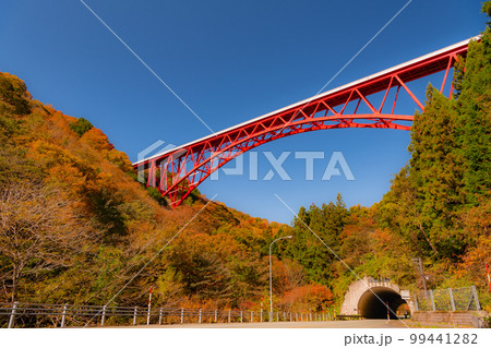 紅葉の奥出雲おろちループ三井野大橋と木次線三井野原駅へと向かう奥出雲おろち号 島根県仁多郡奥出雲町