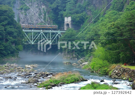 JR上越線「利根川の渓谷と鉄橋を走る電車」