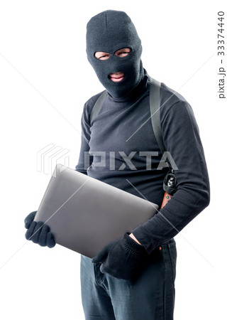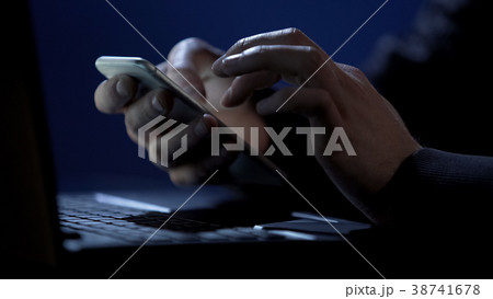 Dangerous anonymous hacker man in hooded and mask using computer and smartphone on black background, breaking into security data corporate server. Internet crime, cyber attack security concept