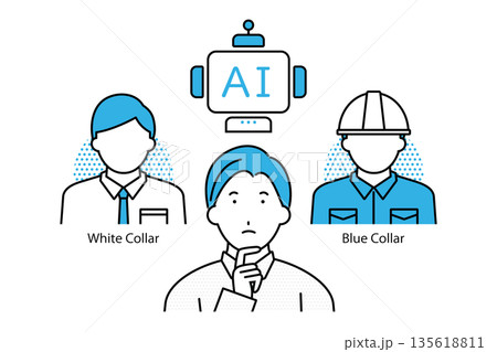AIが進化し続ける状況下でホワイトカラーとブルーカラーのどちらの職業に就くかを迷う若い男性のイラスト