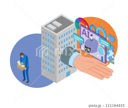 AIロボットに仕事を奪われる男性会社員・アイソメトリック