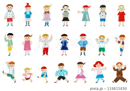 いろんな立っている子供達のイラストセット コミカルな手書きの人物 ベクター、線画にカラー
