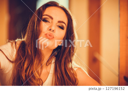 dreamy smiling carefree lady with her stylish hairdo looking at the camera