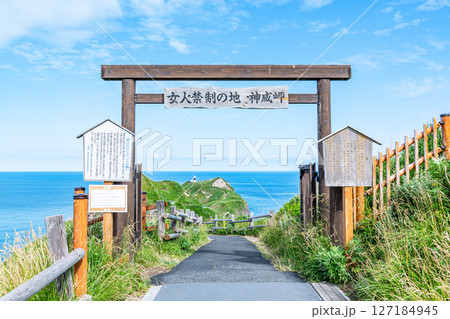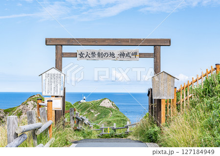 北海道積丹町 夏の北海道 観光名所として有名な神威岬への入口にある女人禁制の門と神威岬灯台