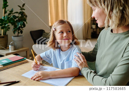 Smiling Mother helps her adorable daughter with homework at living room