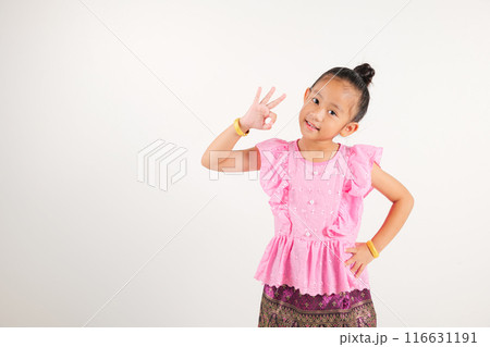 Portrait Thailand kid girl smiling traditional Thai dress costume showcases OK sign with smile, conveying agreement and positivity, studio isolated white background, kindergarten child success sign