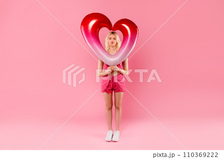 Happy cheerful young woman having fun with balloon wearing red heart shaped sunglasses, jumpsuit