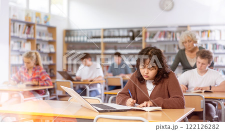 The girl solves the task given in the classroom. The schoolgirl diligently writes in a notebook.