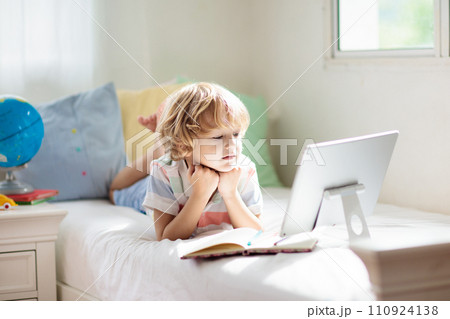 Little girl reads a book and is lying. Distance learning. Home education. School girl girl doing homework. Child with a book in her hands. Bookcrossing