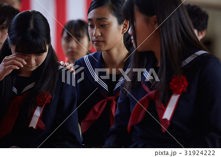 卒業式で別れがつらくて泣く制服の中学生・高校生・小学生の女の子(アジア人・日本人・中国人)