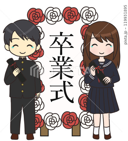 卒業式の看板(バラ)の前にいる制服の男女(涙)