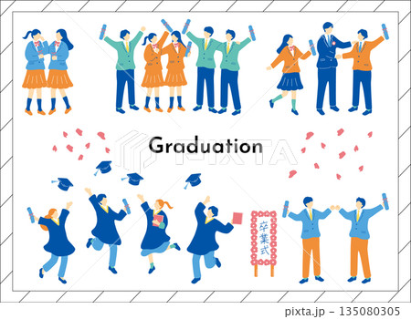 卒業式の男子高生と女子高生のシンプルな全身イラストセット