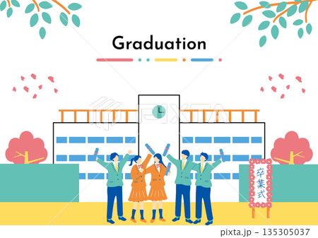 卒業式で色々な表情をする色々な制服の男女の学生と桜