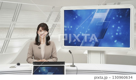 テレビ局の報道スタジオでニュースを読む若い女性アナウンサー