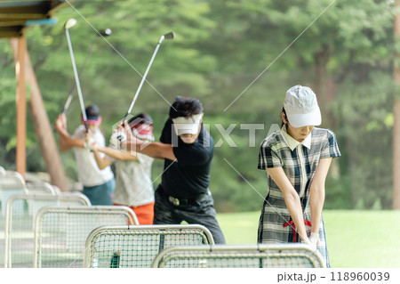 ゴルフ練習場・打ちっぱなし・ゴルフセンターでスイングの練習するゴルフ選手・ゴルファーの男女