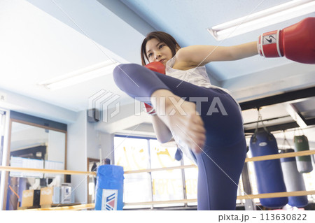 ジムでボクササイズ運動するかっこいい女性 右の拳で殴る パンチ